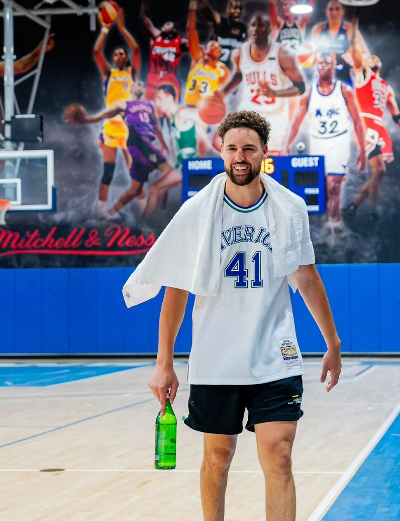 图中的克莱-汤普森身着一件达拉斯独行侠名宿诺维茨基的复古球衣。