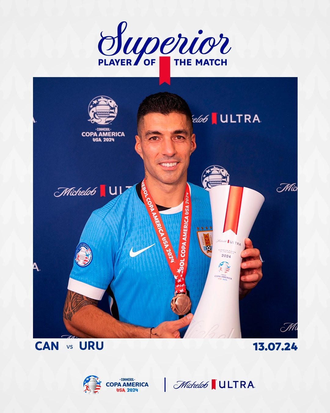 2024年美洲杯三四名决赛,乌拉圭通过点球大战击败加拿大,拿到美洲杯季军,此役为乌拉圭攻入绝平进球的苏亚雷斯当选美洲杯官方全场最佳球员。