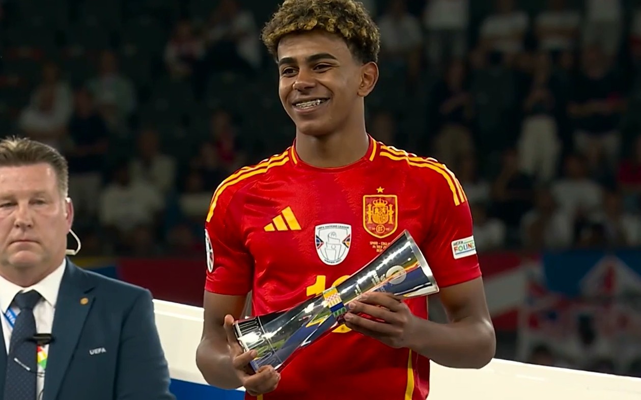 在2024欧洲杯的决赛中,刚刚年满17岁的亚马尔送出1次助攻,最终帮助西班牙2-1战胜英格兰,队史第四次捧起德劳内杯,而亚马尔自己也赢得了赛事的最佳新人奖。