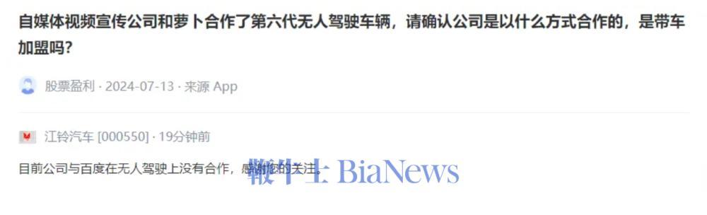 鞭牛士 7月15日消息,近日,百度萝卜快跑引发热议。针对投资者在互动平台咨询的问题,江铃汽车在表示,目前公司与百度在无人驾驶上没有合作。