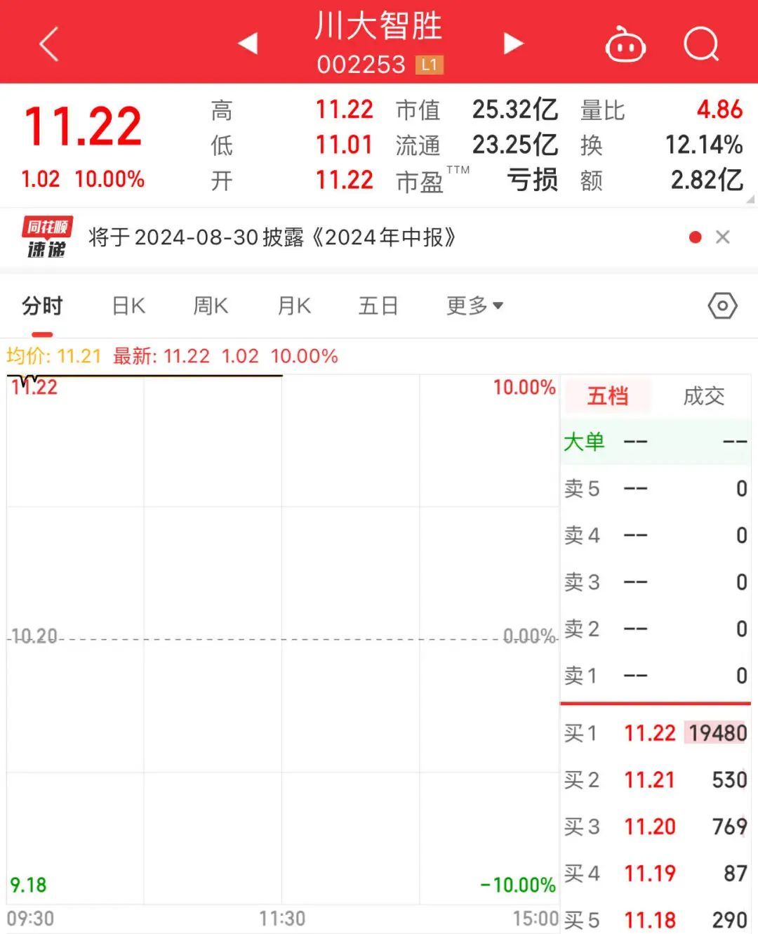 7月15日一早,川大智胜(002253) 竞价涨停,报11.22元,空降同花顺股票人气榜第2。
