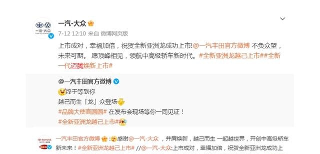 最近一汽丰田亚洲龙新车上市,品牌大使高圆圆为其助阵。高圆圆是许多人心中的女神,他和赵又廷作为夫妻,分别代言亚洲龙和迈腾,一汽丰田和一汽-大众也进行官方互动,可谓“上市成对,幸福加倍”。迈腾希望与亚洲龙“顶峰相见,领航中高级轿车新时代”,不仅吸引了更多粉丝的关注,也让人感受到了一汽-大众充满活力,越来越会玩的魅力。