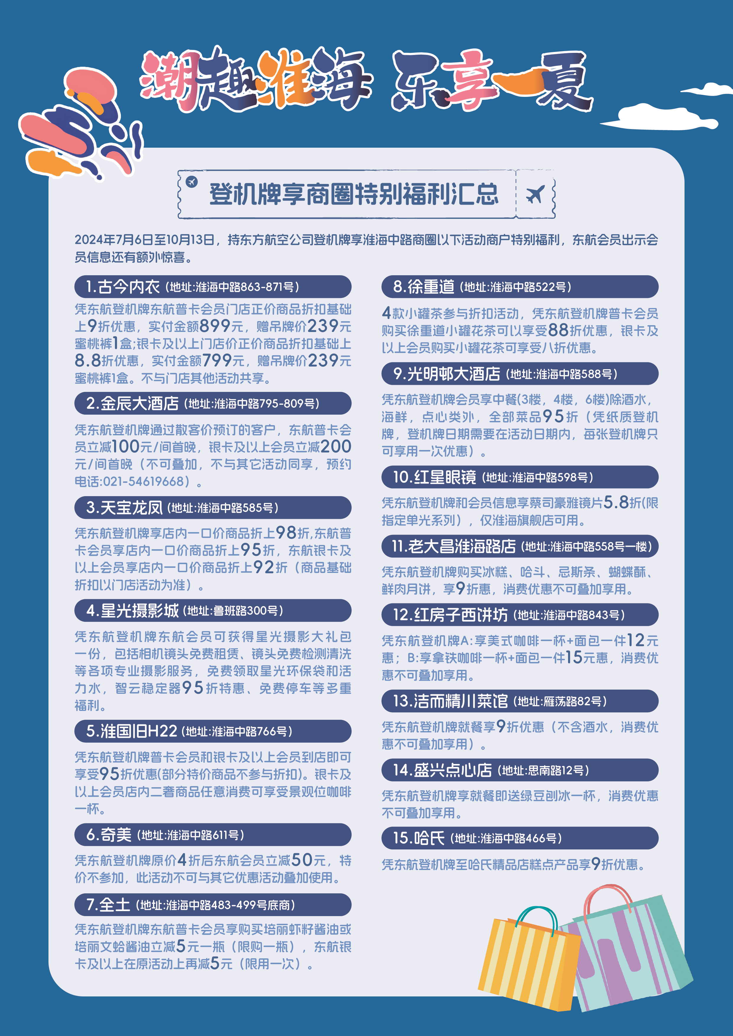 参与本次淮海集团登机牌享商圈特别福利的品牌,包括古今、星光摄影、天宝龙凤、红星眼镜等老字号品牌,以及金辰大酒店、淮国旧H22、奇美、上海全国土特产商场等知名商户,还汇集了光明邨大酒店、老大昌淮海路店、红房子西饼坊、洁而精川菜馆、盛兴点心店、哈氏等深受喜爱的上海老字号美食,纷纷展开独家优惠活动,联动打造夏日消费热点,增强“潮趣淮海 乐享一夏”的持续吸引力。