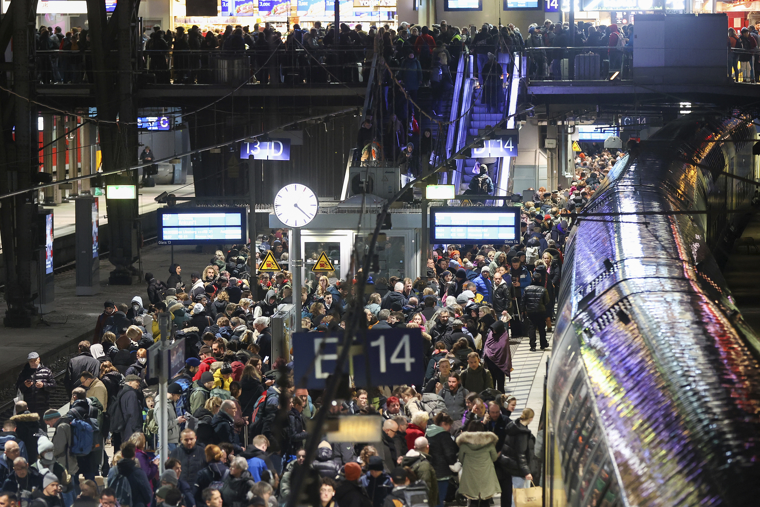 当地时间2023年12月21日,德国汉堡,风暴“佐尔坦”导致德国铁路列车大面积延误,许多旅客在站台上等待火车。
