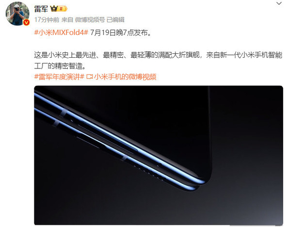 【CNMO科技消息】小米本月的发布会时间已经官宣:定档7月19日晚7点。本周五晚上,小米科技创办人、董事长兼CEO雷军将举办第5次“雷军年度演讲”,讲讲造车的来龙去脉和这三年多跌宕起伏的故事。小米MIX Fold 4也将在这次活动中亮相。