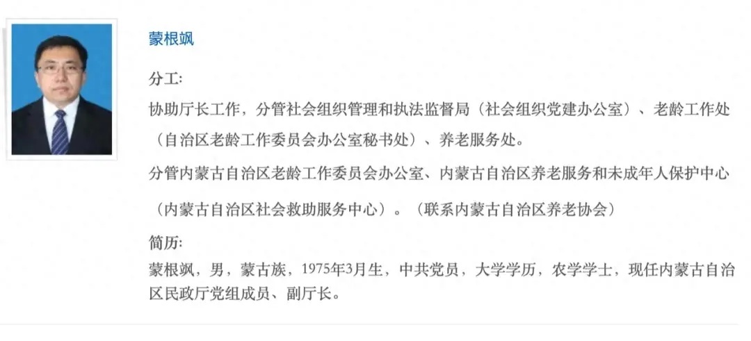 7月16日,据内蒙古晨报消息,近日,内蒙古自治区民政厅官网“厅领导”一栏更新后显示,蒙根飒已任自治区民政厅党组成员、副厅长。