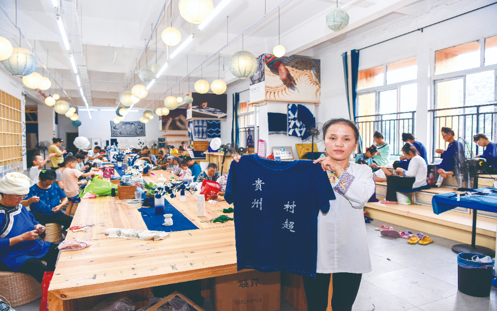 石本然所在的特和社区“母亲回家”手工坊,与村超相关的文创产品都很畅销,足球、包包、围巾、鞋子……很多日常用品都被融入村超、蜡染、刺绣等元素。这家手工坊的总经理助理于海峰介绍,村超“出圈”以来,各类文创产品销量增长了20%以上。