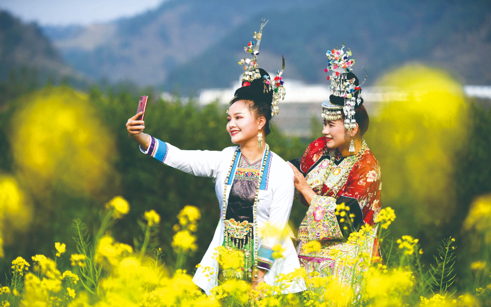 盛装打扮的侗族姑娘在榕江县乐乡侗寨油菜花田间自拍。 新华社发