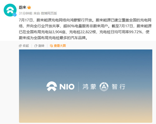 7月17日,蔚来在官微上宣布,蔚来能源与华为鸿蒙智行达成服务合作,蔚来能源充电网络将向鸿蒙智行品牌车型(包括问界、智界、享界等)开放。