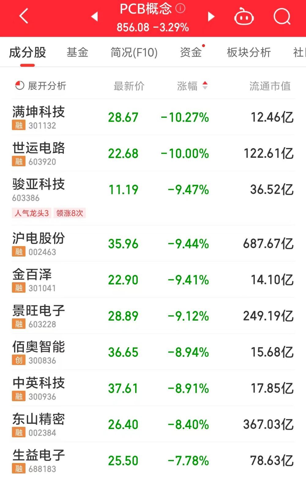 同花顺数据显示,PCB概念板块今日收跌3.29%。除了世运电路,沪电股份、骏亚科技、景旺电子、东山精密等PCB概念股均跌超8%。
