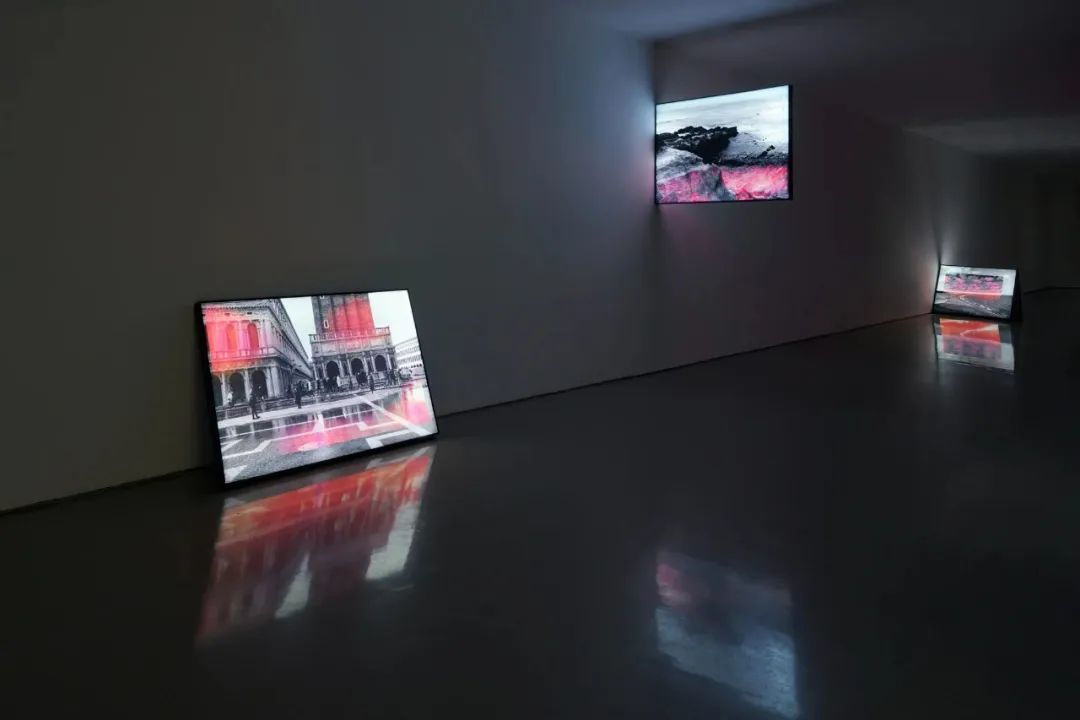 黎晓亮造访了冰岛、荷兰、意大利、印尼等地,以影像的方式记录下了位于荷兰将海水拦成两半的大坝;冰岛现存最大冰川的冰洞;德国卡塞尔博伊斯的“7000颗橡树”;威尼斯常年被水淹的广场;阿尼玛卿雪山下融化的冰川等等。他将不同地点的自然温度,并将这些温度影像嵌入其对应场景之中,并尝试通过海平面将多屏幕展示的画面相连。