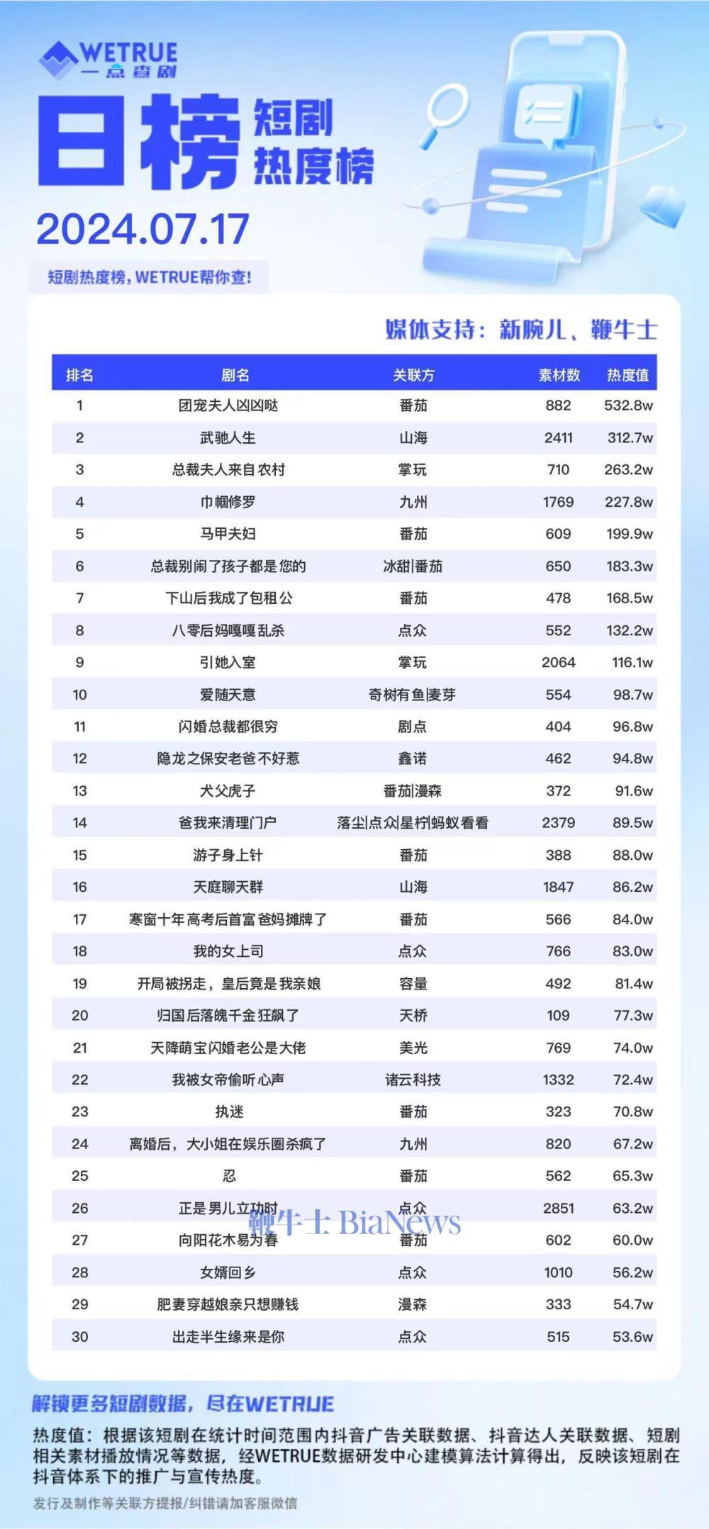 编者按:为帮助短剧从业者提供更多信息,专注于短剧报道的新腕儿和科技媒体鞭牛士联合WETRUE短剧热度榜共同推出短剧热度榜。