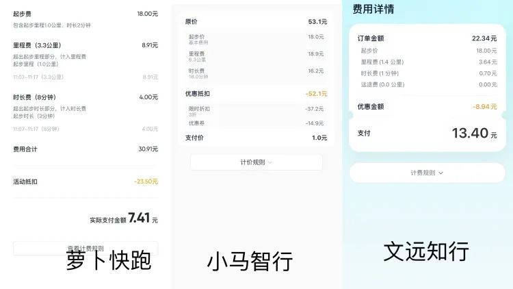 最大的区别在于三家目前的补贴力度不同,从体验来看,目前小马智行的补贴力度最大,文远知行的补贴力度最小。