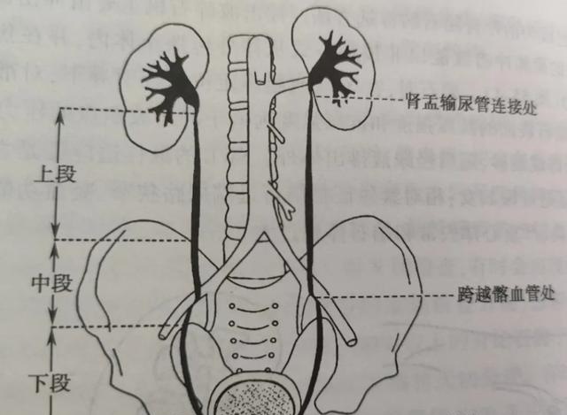 如下图所示,输尿管有三处生理性狭窄,而这三处狭窄正是结石容易卡顿的地方。