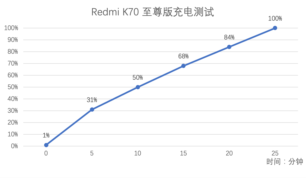 实测 Redmi K70 至尊版在打开极速充电模式下,5 分钟即可从 1 % 充至 31% 电量,10 分钟充至一半,最后在 25 分钟出头就充至 100% 电量。快是挺快的,但在开启极速模式下 Redmi K70 至尊版充满电后发热还是挺明显的,需要注意一下。