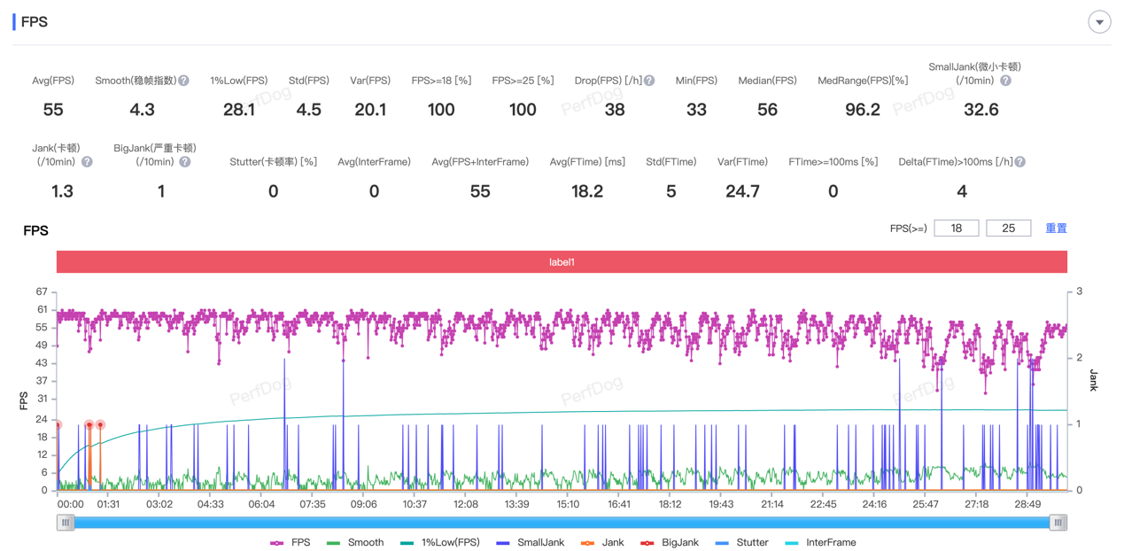 对于 Redmi K70 至尊版星穹铁道的帧率表现可以展开来说说,前 12 分钟的性能调度非常激进,跑出了 57.3 帧的成绩,功耗也到了 8W;到了 12-25 分钟后,或许是发热量上来了,所以主动降低了 CPU 的频率,平均帧率也下降到 54.9 帧,功耗为 7.8W;最后的 5 分钟或许热量已经达到阈值,超大核出现了锁频的情况,尽管画面流畅度有所下降,但 A720 大核的频率没变,调度还是挺激进的。
