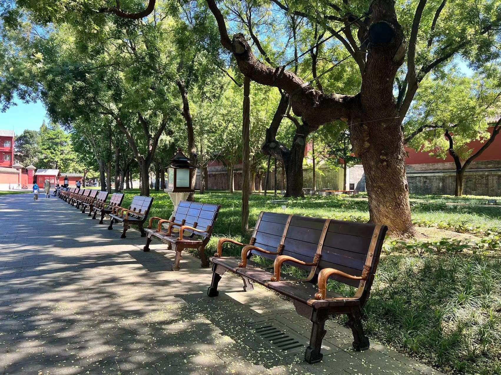 炎炎夏日,记者在故宫十八槐区域、箭亭广场区域看到,在苍翠古树的树荫下,一排排路椅整齐排列,不少观众坐在路椅上休息。以往,一些暴露在广场等空旷处的路椅因长时间暴晒而少有观众问津,于是故宫结合院内日照特点,对于一些长时间暴晒的路椅调整位置。故宫博物院内开放区域共有路椅1151把,每把路椅重约300斤,由开放管理处采取人力及电动车运输的方法搬运至阴凉处,为观众提供休憩环境。