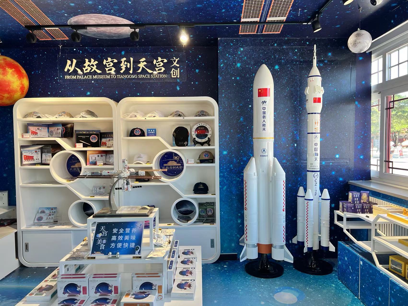 “太空茶吧”位于箭亭广场东侧,同时也是“从故宫到天宫文创店”。在这里,观众可品尝到与神舟十一飞行食谱同标准的天宫红茶和天宫绿茶。该区域设置了航天科普展览区、故宫文创区等特色空间。太空茶吧的室内空间按照空间站1:1打造,观众走进这里仿佛置身于空间站,可一边品茶一边参观航天科普展览。