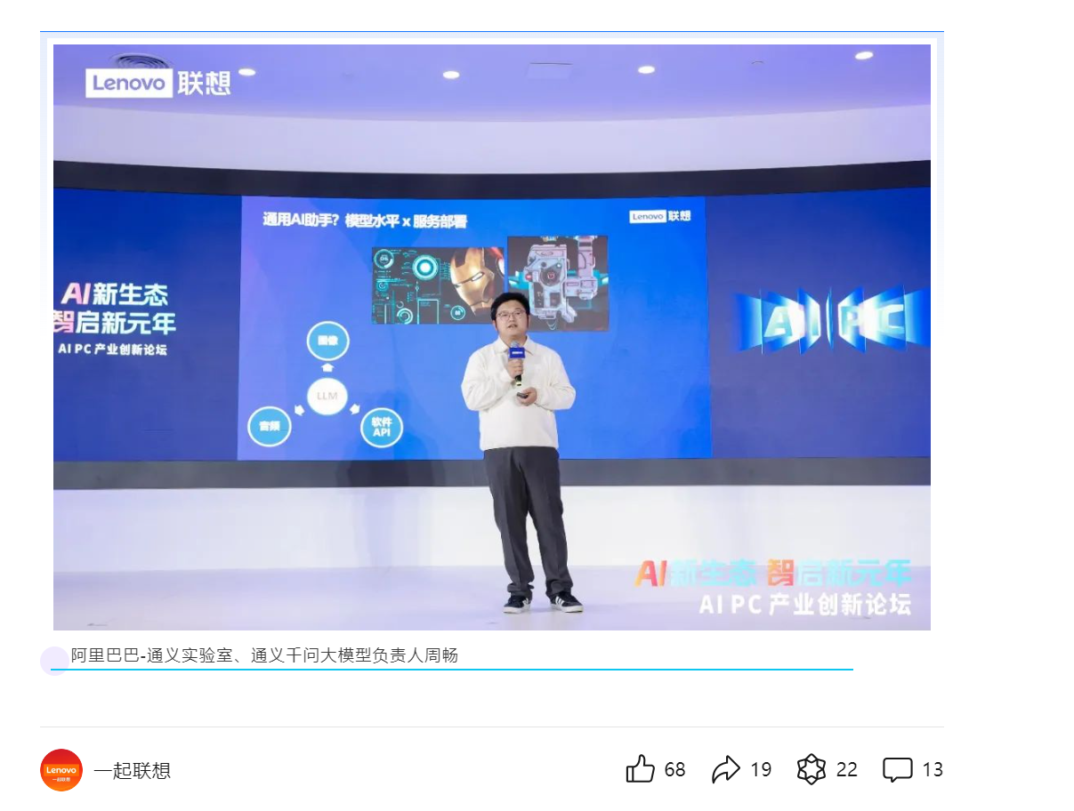 去年底,周畅曾作为阿里巴巴-通义实验室、通义千问大模型负责人,受邀出席了首届AI PC产业创新论坛。当时,周畅分享了关于端侧大模型的技术进展,以及终端设备与AI结合的发展前景。