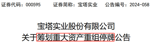 7月18日晚,宝塔实业发布公告称,公司正在筹划通过重大资产置换及发行股份方式,收购宁夏电投新能源100%股权,同时拟向不超过35名特定投资者发行股份募集配套资金。公司股票自2024年7月19日(星期五)开市起停牌。