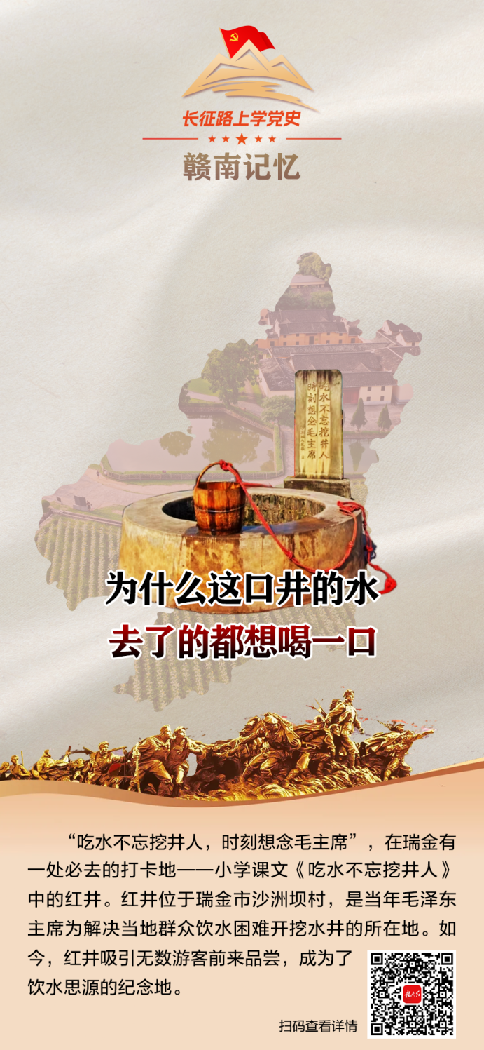 苏区时期,沙洲坝是个干旱缺水的地方。加上中央机关的进驻,军民用水顿时更加紧张。看到群众在挑池塘里的水喝,毛泽东带领战士和乡亲们挖了一口井。红军长征之后,国民党把这口井填了,但乡亲们晚上又暗暗地把它挖开。1951年,中央派出慰问团来到瑞金,沙洲坝村民把这口井重新整修,正式取名为“红井”,还在井旁边立了木牌,写着“吃水不忘挖井人,时刻想念毛主席”,以后又将木牌改成了现在的石碑。