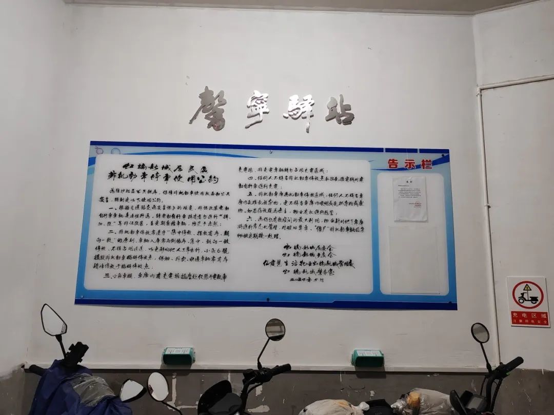 如今,《非机动车停车使用公约》由社区书法达人王嘉平书写成楷体,并被制作成硕大的宣传展板,悬挂在墙面上。至此,电动自行车整治也成为虹桥新城“馨”系列社区治理的最新成果,被命名为“馨宁驿站”。