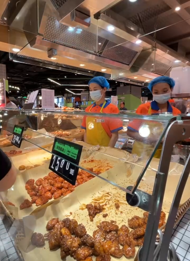 鲜食加工区负责人介绍:“我们借鉴学习胖东来,引入了7家胖东来鲜食供应链,一系列网红产品,如豆瓣甜肠、香辣牛肉干、韩式炸鸡等特色爆款,相信顾客会喜爱”。