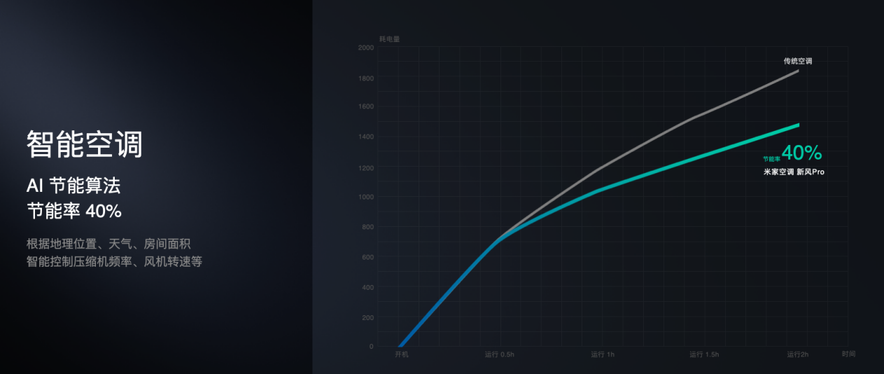 米家双出风空调内置了小米自研灵云智控引擎,灵云节能可根据空调的地理位置、天气、房屋面积,智能识别用户的个性化负载,保证空调在高能效和高舒适度水平上运行,应用灵云智控引擎的米家双出风空调节能率可高达40%。