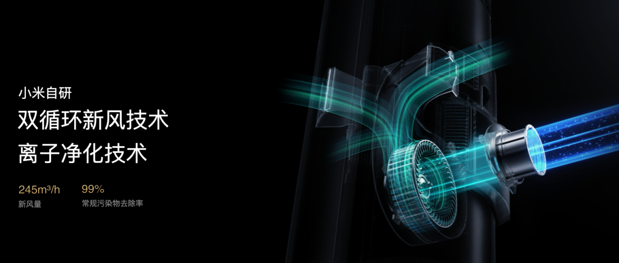 最高配的米家空调新风Pro双出风,配备了小米自研双循环新风系统,能够实现外循环新风和内循环净化。外循环新风,可将外部空气引入室内实现空气换新,米家空调新风Pro双出风拥有245m³h(新开孔)大新风量,仅需22分钟即可实现全屋换新空气。内循环净化通过循环室内空气,经过HEPA滤网过滤和小米离子净化技术过滤,实现室内空气净化,实现类似空气净化器的作用。