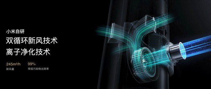 最高配的米家空调新风Pro双出风,配备了小米自研双循环新风系统,能够实现外循环新风和内循环净化。外循环新风,可将外部空气引入室内实现空气换新,米家空调新风Pro双出风拥有245m³h(新开孔)大新风量,仅需22分钟即可实现全屋换新空气。内循环净化通过循环室内空气,经过HEPA滤网过滤和小米离子净化技术过滤,实现室内空气净化,实现类似空气净化器的作用。