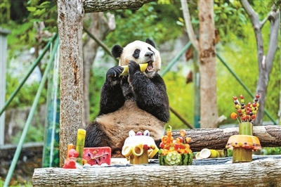 昨日,中国大熊猫保护研究中心主办的“‘食’光不语成长有迹”大熊猫生日季丰容活动在卧龙神树坪基地启动。饲养员们为近期过生日的大熊猫们精心准备了胡萝卜串、西瓜等食物丰容。图为大熊猫“小奇迹”在吃竹笋。供图/新华社