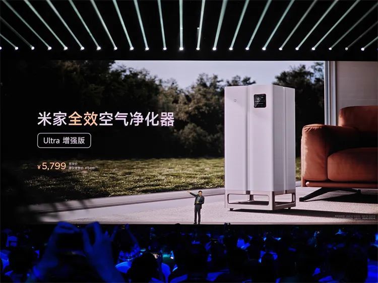 在智能家居产品方面,小米带来了米家全效空气净化器Ultra 增强版,可监测6类污染物和 10 层复合净化,配备醛能解专效滤芯能将甲醛催化分解为二氧化碳和水,避免二次污染,且无需更换滤芯,首发价5799元。