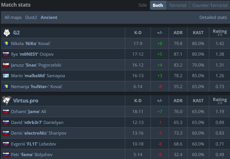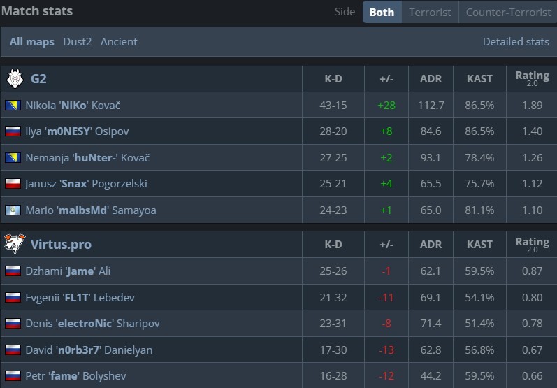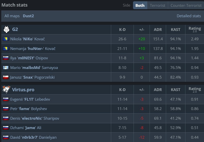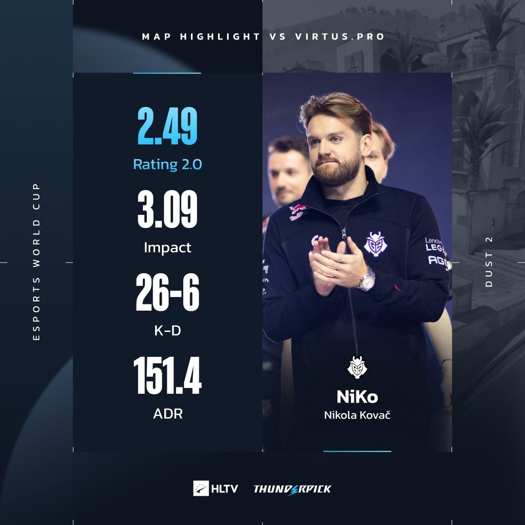 VP 3-0开局但G2紧接着轰下9-0的小高潮,波黑兄弟火力全开单图合砍47个击杀,Niko更是直接打出2.49的逆天rating,刷新了个人CS2时代的单图最高rating。