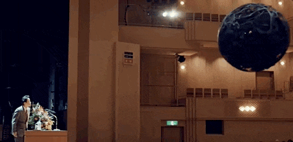 而黑球缓慢靠近,在与市长身体接触的一瞬间,市长的上半身消失了,台下的观众也被吓到落荒而逃。