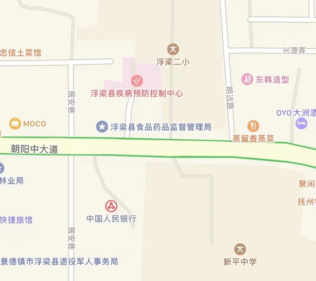 1.景北高速收费站→朝阳西大道(含道路南面至昌江河边)→佛印街→东坡路→青山路→浮梁大道→杭瑞高速桥→高速路往西→景北高速收费站;此路段范围以内区域为浮梁四小招生范围。