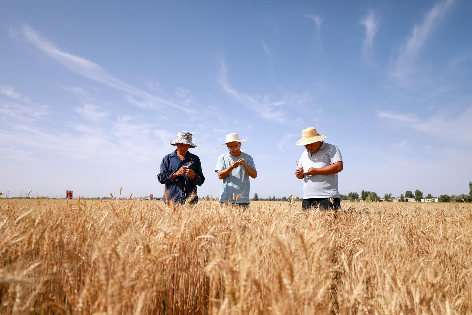 “我们这个示范点今年种植小麦1000余亩,现在来看颗粒有光泽、比较饱满,预计亩产可达520公斤。最近天气比较好,适宜小麦机械化收割,这些小麦两天就可以收割完。”金塔县东坝镇小河口村党支部书记、村委会主任赵成兵说。