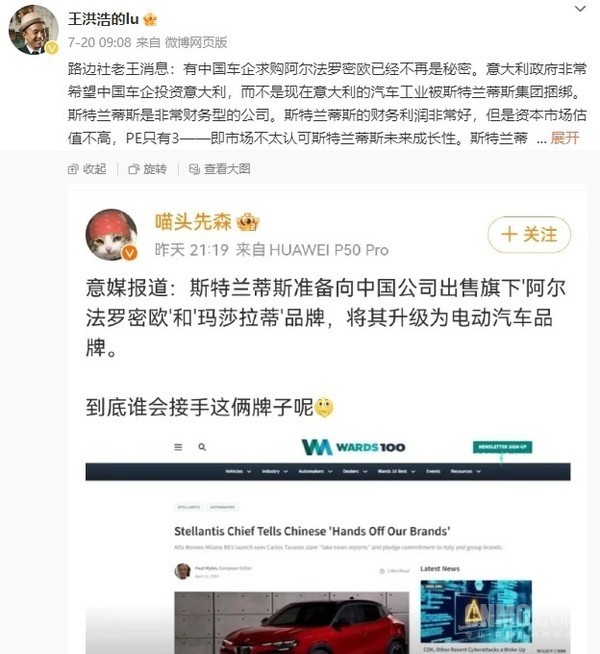 “至于谁在考虑买阿尔法·罗密欧,东风、吉利、奇瑞、比亚迪等等对欧洲感兴趣的品牌都是潜在的交易方。”