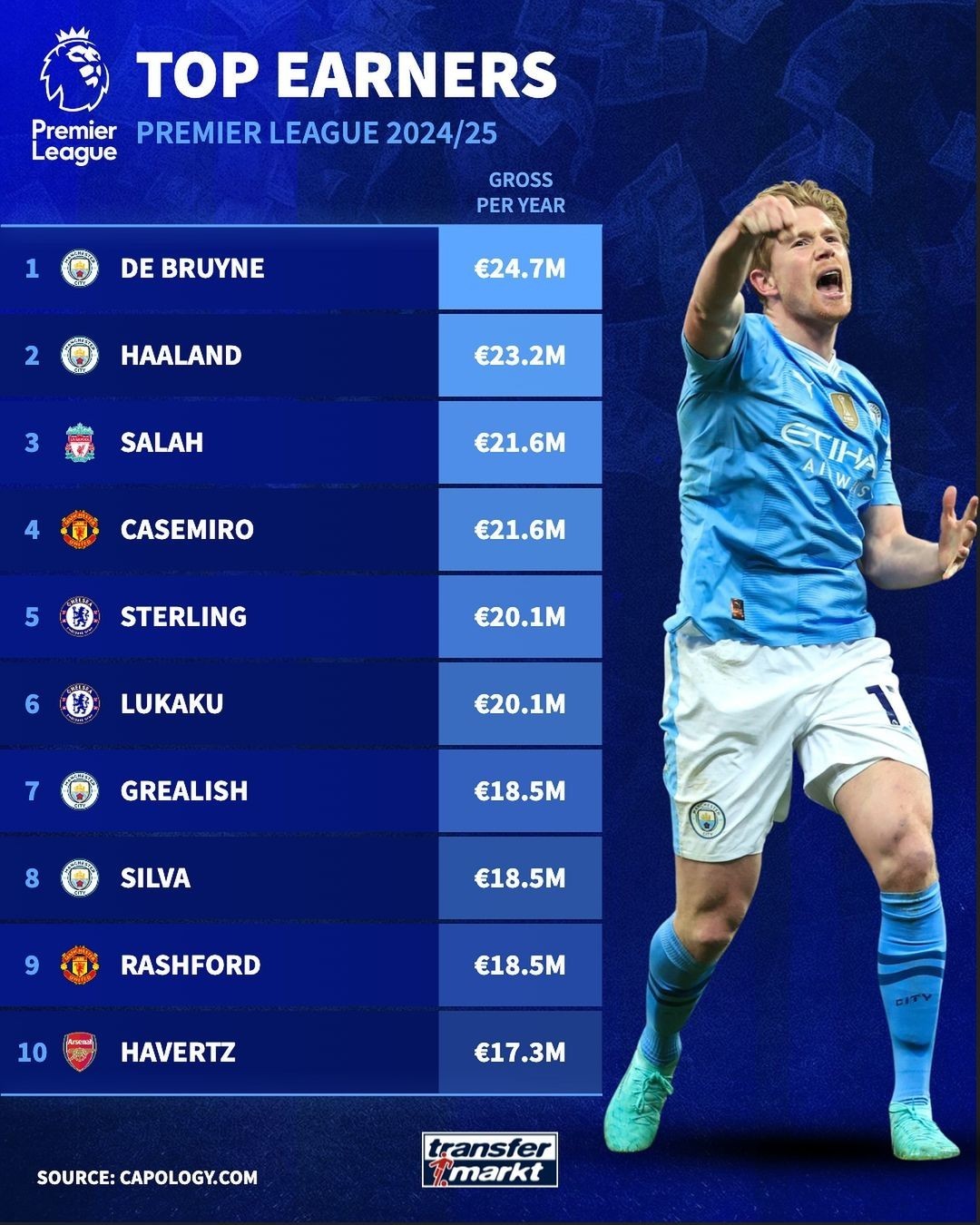最近,德国转会市场列出了英超球员在2024/25赛季的税前年薪排行榜。其中,德布劳内、哈兰德、卡塞米罗位列前三。
