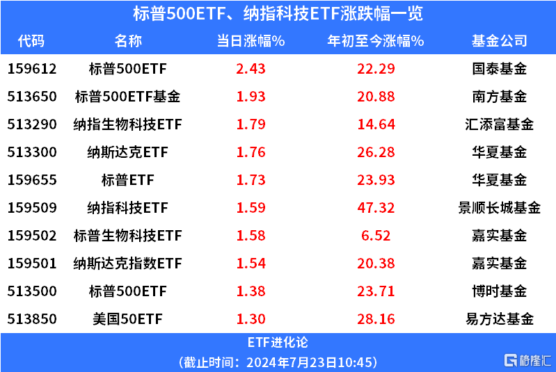 跨境ETF上涨,国泰基金标普500ETF涨超2%,南方基金标普500ETF基金、汇添富基金纳指生物科技ETF、华夏基金纳斯达克ETF、华夏基金标普ETF、景顺长城基金纳指科技ETF、嘉实基金标普生物科技ETF、嘉实基金纳斯达克指数ETF、博时基金标普500ETF、易方达基金美国50ETF上涨。