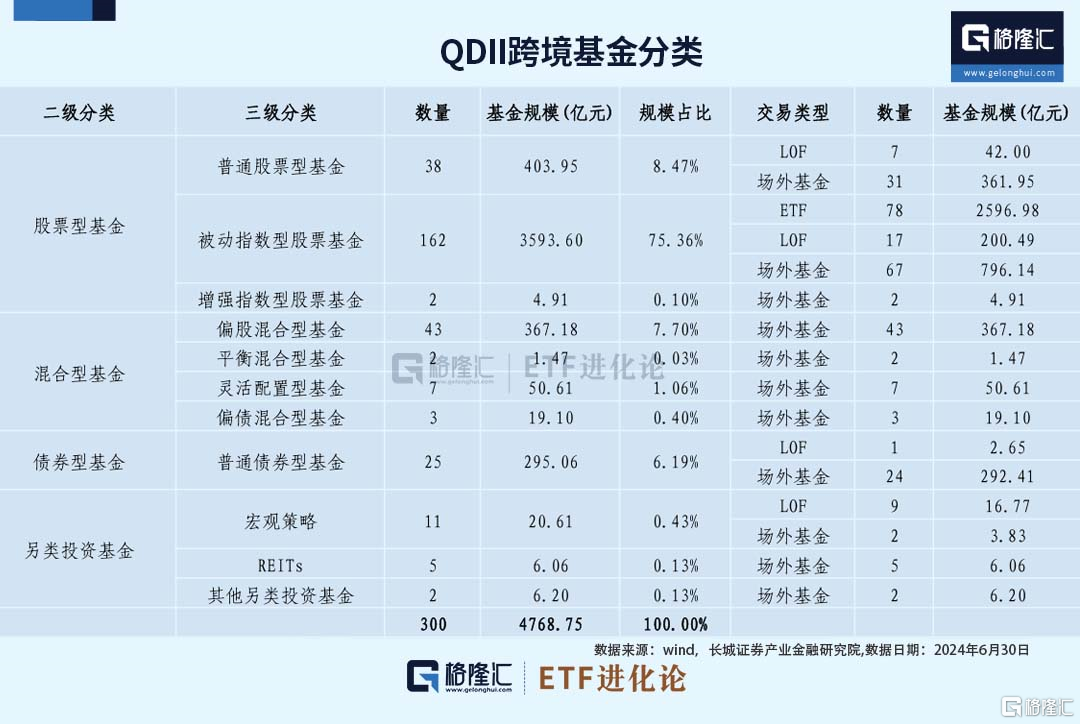 作为投资境外资产的主要通道QDII跨境基金这两年很火。根据长城证券统计,截止2024年6月30日,QDII跨境基金规模共计4768.75亿元。其中,被动指数型基金占据绝对权重,规模占比超过75%。