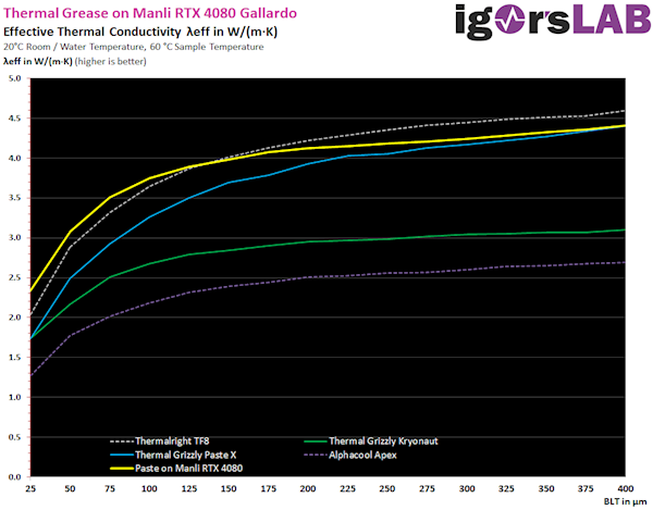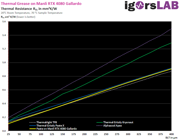 Igor's Lab分析后认为,RTX 40系列普遍使用了质量很差的硅脂,使用铝氧化物颗粒可以在短时间内显示极好的散热性能,但油性混合物很容易流出、挥发,导致硅脂散热能力大大下降,甚至反而起到隔热的作用。