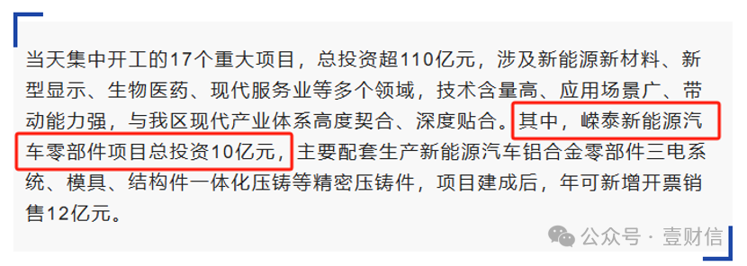 但据“今日江都”(扬州市江都区融媒体中心新闻发布号)于2024年4月14日发布的一则标题为“总投资超110亿元!江都17个重大项目集中开工……”的新闻报道,内容提及嵘泰股份的新能源汽车项目总投资额达10亿元,较募集说明书中多出超一个亿。