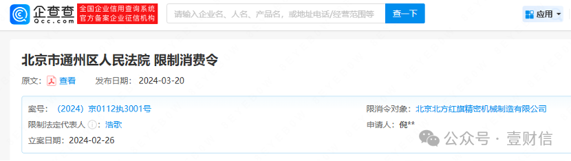 在2024年的3月20日,北京市通州区人民法院还发布限消令,对北方红旗公司的法人采取限制高消费措施。6月21日北方红旗再次被法院限制高消费。