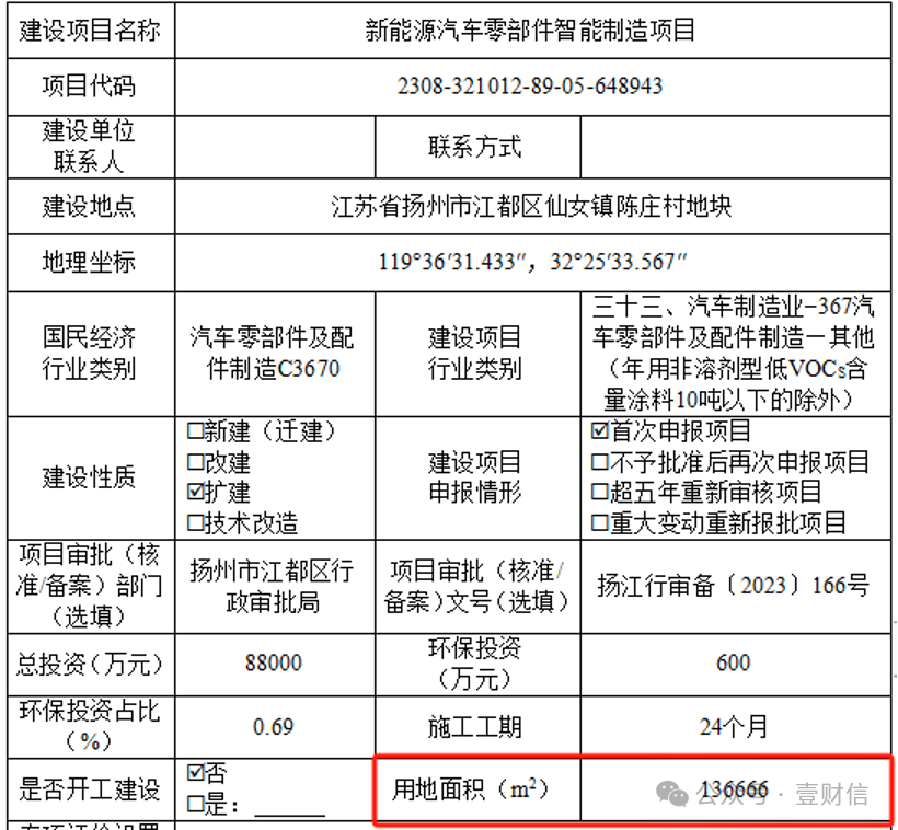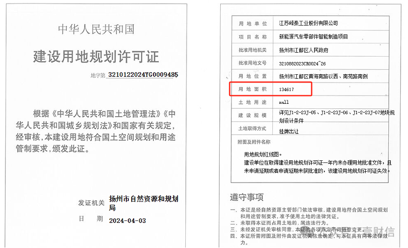 此外,根据新能源汽车项目环评文件,该项目的用地面积为136,666平方米。但在扬州市自然资源和规划局2024年4月3日发布的建设用地规划许可证中,却显示新能源汽车项目的用地面积为134,617平方米,比环评文件中披露的面积少了2,049平方米。