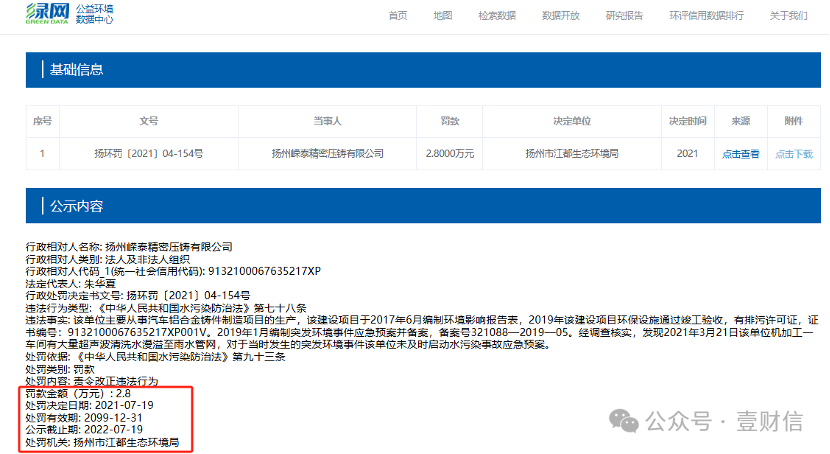 扬州嵘泰精密压铸有限公司(下称:嵘泰压铸)为嵘泰股份直接持股100%的全资子公司。据绿网,2021年3月21日,嵘泰压铸机加工一车间有大量超声波清洗水漫溢至雨水管网,对于当时发生的突发环境事件嵘泰压铸未及时启动水污染事故应急预案,因此2021年7月19日扬州市江都生态环境局对嵘泰压铸处以罚款2.80万元。