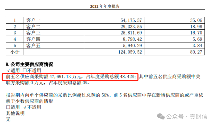 但在嵘泰股份2022年年报中,却显示该年度向前五名供应商采购额为47,691.13万元,占当期采购总额48.42%,这一金额较募集说明书中少了2,674.47万元,占当期采购总额的比例也存在出入。