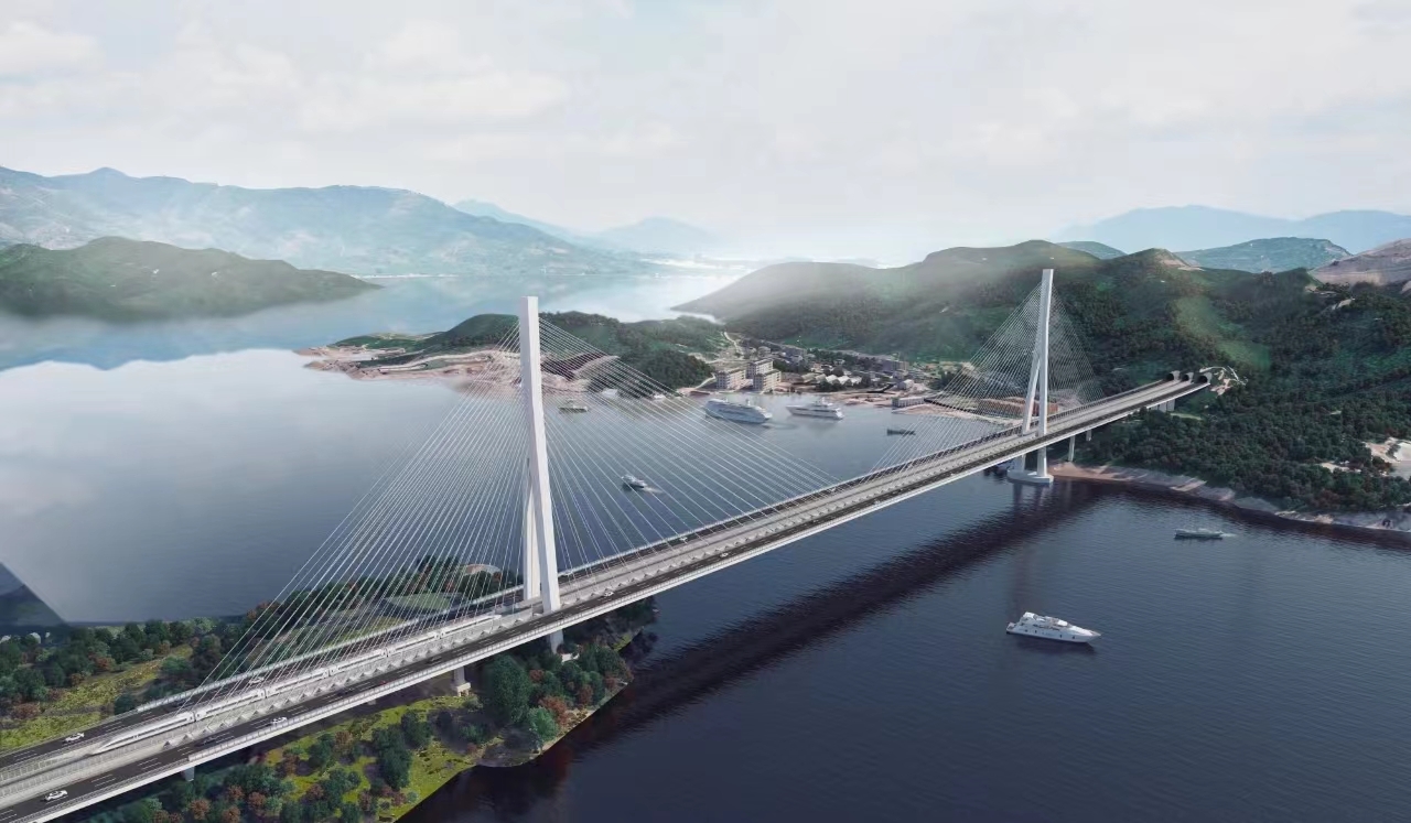 作为甬舟铁路的关键性工程之一,桃夭门公铁两用大桥全长约1531米,其中公铁合建段长1066米,连接册子岛和富翅岛。主桥采用主跨666米混合箱梁斜拉桥,是世界首座三箱分离式混合梁斜拉桥;公、铁采用平层布置,铁路为双线设计,布置在中间,设计时速250公里,公路为双向6车道高速公路,分幅布置在两侧,设计时速100公里,是世界目前最大跨度公铁两用混合梁斜拉桥;中跨主梁采用分离式钢箱梁,边跨主梁采用混凝土箱梁,梁宽66米,是世界目前最大宽度分离式混凝土箱梁。