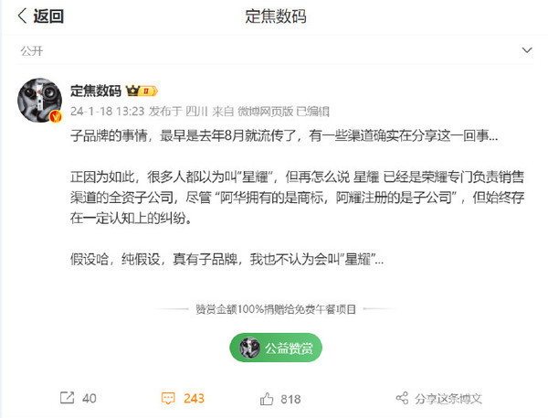 据CNMO了解,该博主此前也分享过“星耀子品牌”的观点。其表示,华为子品牌的事情,最早去年8月就流传了,有一些渠道确实在分享。正因如此,很多人都以为叫子品牌叫“星耀”,但星耀已经是荣耀专门负责销售渠道的全资子公司,尽管“华为拥有的是商标,荣耀注册的是子公司”,但始终存在一定认知上的纠纷。即便真有子品牌,博主认为也不会叫“星耀”。