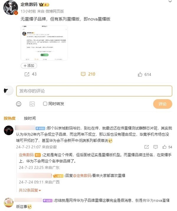 有网友评论称,有传闻称星耀子品牌机型正测试麒麟芯片,但他认为华为两年内不会成立子品牌,而这两年不成立,那以后也没有理由成立,毕竟手机市场也没啥可开拓的了,甚至华为会不会新开中低端系列都很难说。对此,辟谣博主称:之前是有这个传闻,但后面被证实是星耀版机型。而星耀品牌注册名在荣耀手上,华为不会用这个名字做品牌了。