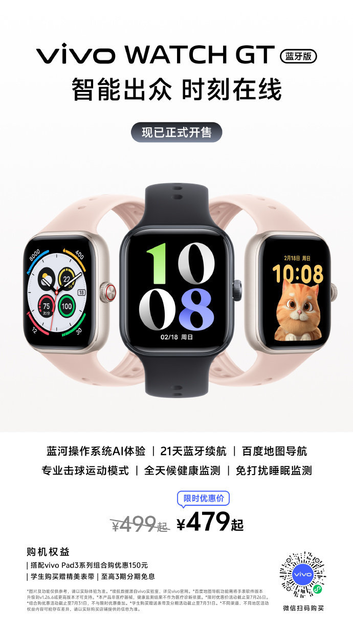 vivo Watch GT蓝牙版售价 499 元起,现在限时优惠只需 479 元起,喜欢的朋友不要错过啦。